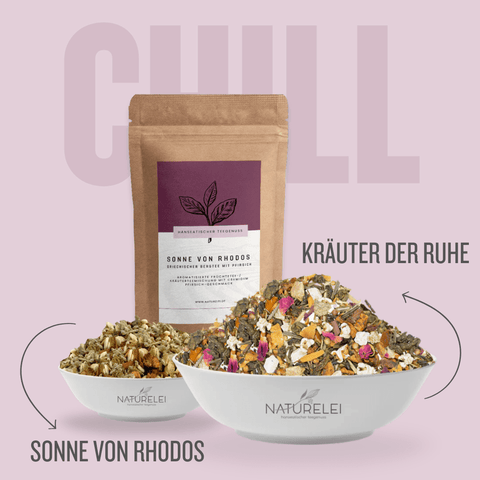 Ein stressiger Arbeitstag geht zu Ende, die Kinder haben schlechte Laune, das Wetter ist mies und irgendwie klappt nichts so wie es soll. Wer kennt diese Tage nicht? Dabei wissen wir alle, dass Stress ungesund ist und wir immer dafür sorgen sollten ausgeglichen zu sein und unsere Mitte wiederfinden sollten. Unsere "chilligen" Teesorten, die wir für euch zusammengestellt haben, können euch dabei helfen. Sie versorgen dich mit wohltuenden und/oder natürlich beruhigenden Zutaten. Unsere Hanftees sind z.B. reich an Antioxidantien, Omega-3-Fettsäuren, Vitamin E, B-Vitaminen und alle neun essenziellen Aminosäuren.Unser Matcha-Pulver ist nicht nur ideal als Aufgussgetränk, da es reich an Aminosäuren, wie z.B. L-Theanin ist, welches u.a. für Entspannung und Stressreduktion sondern auch für eine lang anhaltende Wachsamkeit sorgen kann. Aber auch die Gehirnleistung, Konzentration, Stimmung und Gedächtnisleistung kann Matcha-Tee positiv beeinflussen. Perfekt also für einen produktiven Tag!Lass die Dinge für einen Moment ruhen und kümmere dich um dich selbst! Für deinen Körper, Geist und Seele! Denn Gesundheit ist das höchste Gut