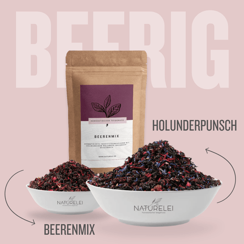 Ganz klar: Beeren im Tee gehören schon zu den Klassikern, denn sie erfreuen sich einfach großer Beliebtheit. Ein positiver Aspekt ist natürlich, dass sowohl unsere Kleinsten als auch Erwachsene Beeren lieben. Die Vielfalt reicht dahingehend von Erdbeeren, Himbeeren, Gojibeeren, Blaubeeren, Johannisbeeren bis hin zu Cranberry, Kirsche oder Berberitze. Die meisten von ihnen schmecken süß bis leicht säuerlich. Harmonisch mit anderen Zutaten, wie z.B. Apfel, Hibiskus, Pfingstrosen oder Orange uvm. runden sie das Geschmackserlebnis ab und lassen einen beerigen Tee in vollem Glanz genussvoll erscheinen.