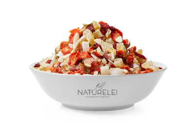 Exotik pur: Süße Mangowürfel und saftige Ananasstücke machen diesen Tee zu einem sonnig-tropischen Geschmackserlebnis. Papaya und Feige schenken eine sanfte, fruchtige Fülle, während geröstete Kokoschips den Hauch von Urlaub unter Palmen perfekt abrunden. Goji-Beeren setzen einen besonderen Akzent und verleihen dem Aufguss das gewisse Extra. Ein Tee, der wie ein Kurztrip in die Tropen schmeckt – fruchtig, frisch und harmonisch.