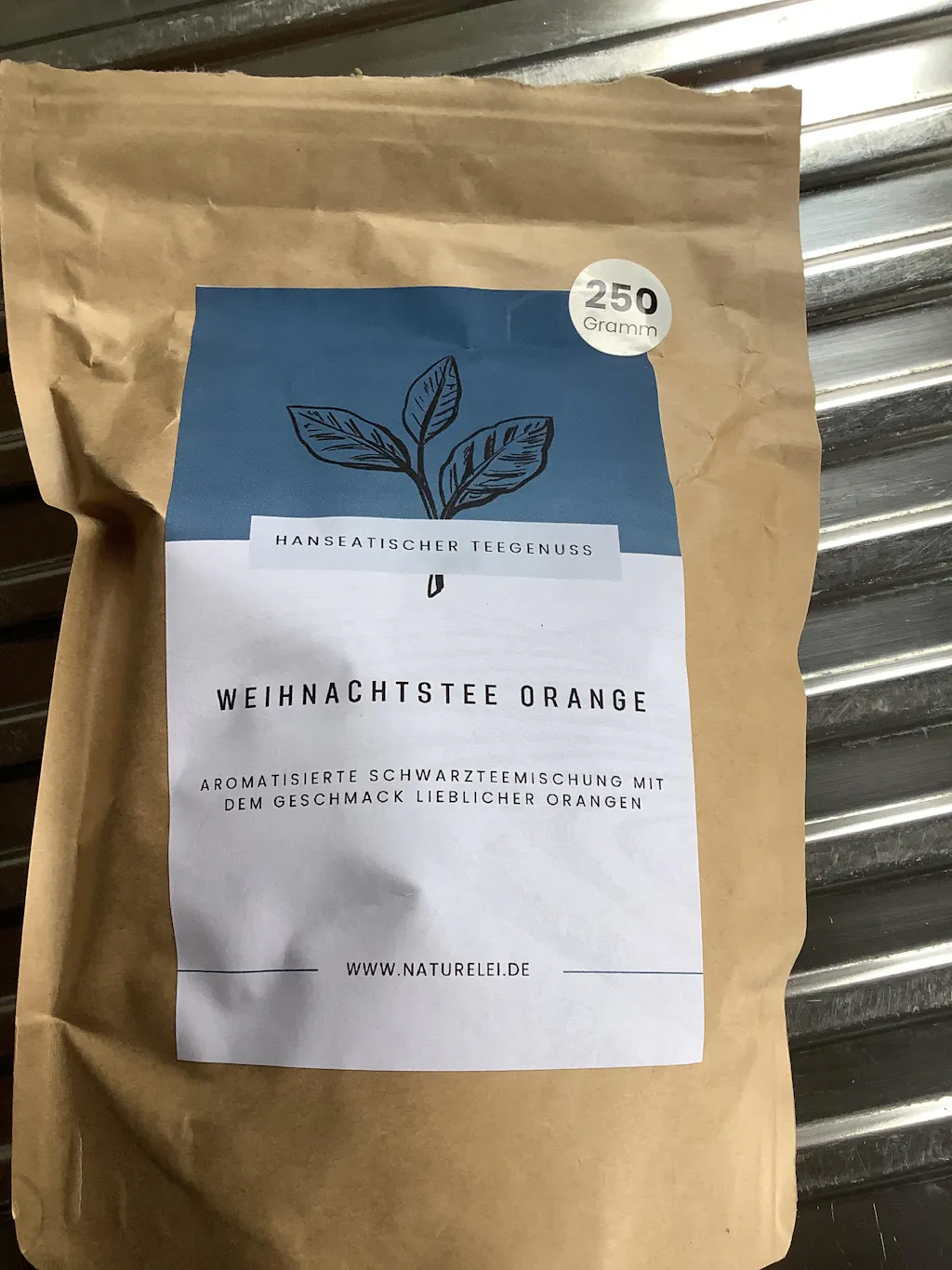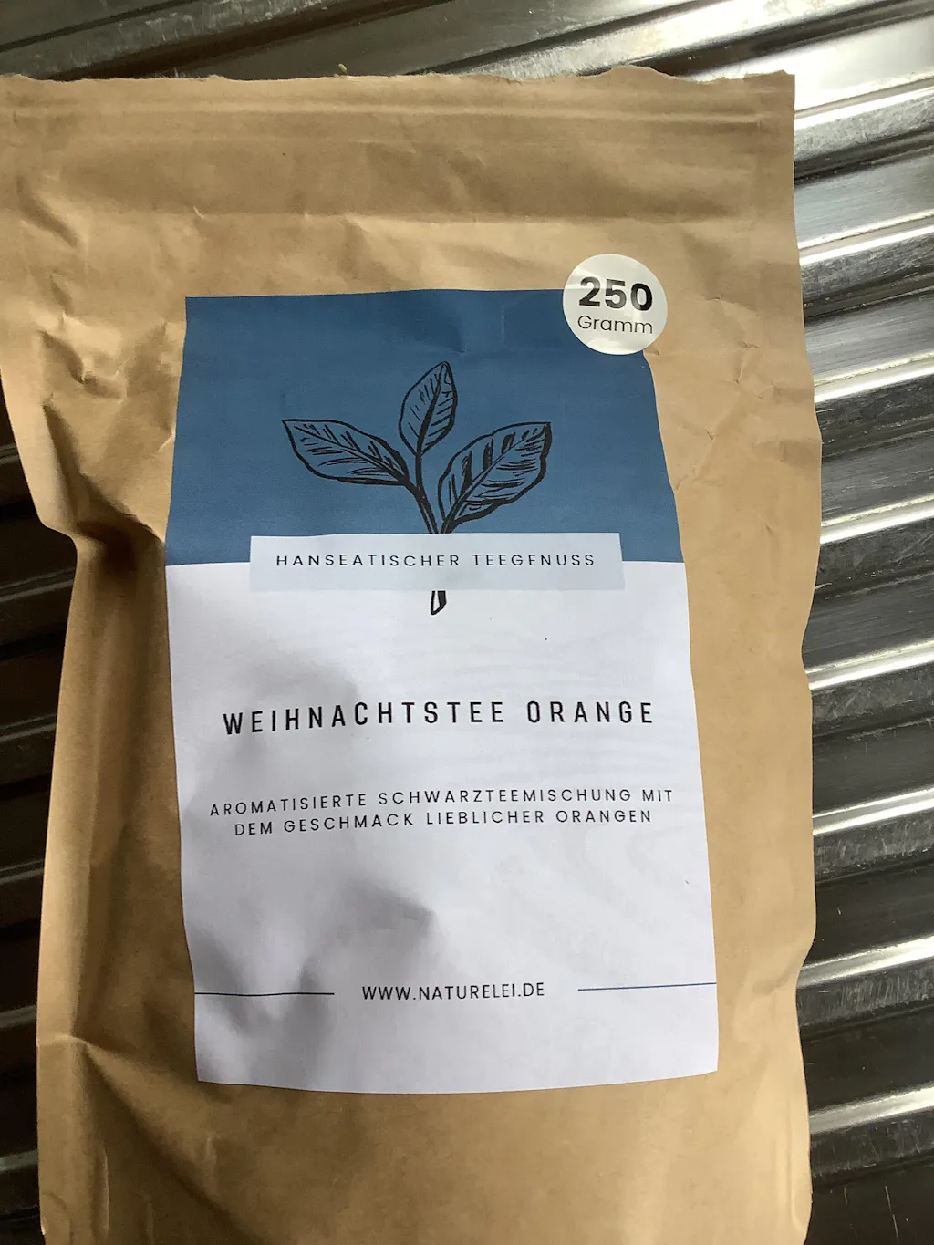 Weihnachtstee Orange schmeckt wie der erste Schritt auf einen festlich beleuchteten Wintermarkt. Kräftiger Schwarztee trifft auf liebliche Orange und wird von Zimt, Nelken und Kardamom würzig umhüllt. Mandeln bringen eine weiche, nussige Tiefe, während Vanille dem Tee eine sanfte Süße verleiht. Rosenblüten runden das Aroma elegant ab und machen jede Tasse zu einem kleinen Winterritual. Ein Tee mit Wärme, Charakter und genau der richtigen Portion Gewürz – festlich, rund und wunderbar aromatisch.