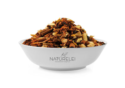 Ein Tee, der sofort an den Duft frisch gerösteter Mandeln erinnert: Süße Apfelstücke, Ananas und Korinthen bilden die fruchtige Basis, während Zimt und Cassiarinde für die typische winterliche Wärme sorgen. Knusprige Kürbiskerne und Kokoschips geben dem Aufguss einen besonderen Crunch, verfeinert durch die Süße von Himbeerflocken und den eleganten Hauch von Rosenblütenblättern. Ein geschmackliches Erlebnis, das Geborgenheit und Wintermarkt-Feeling in jede Tasse bringt.